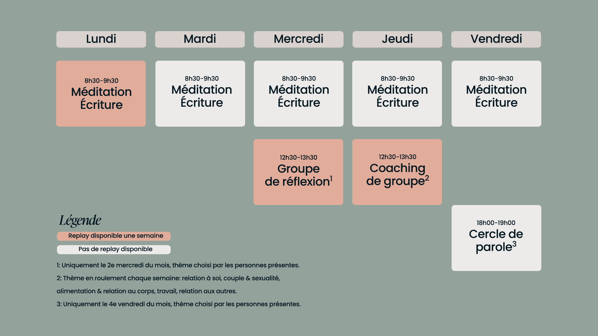 Ici, c’est pareil. Tu viens une, deux, trois fois par semaine… ou plus selon là où tu en es dans ta pratique de la méditation ou de l'écriture. Tu peux aussi juste venir aux coaching ou aux cercles de paroles.